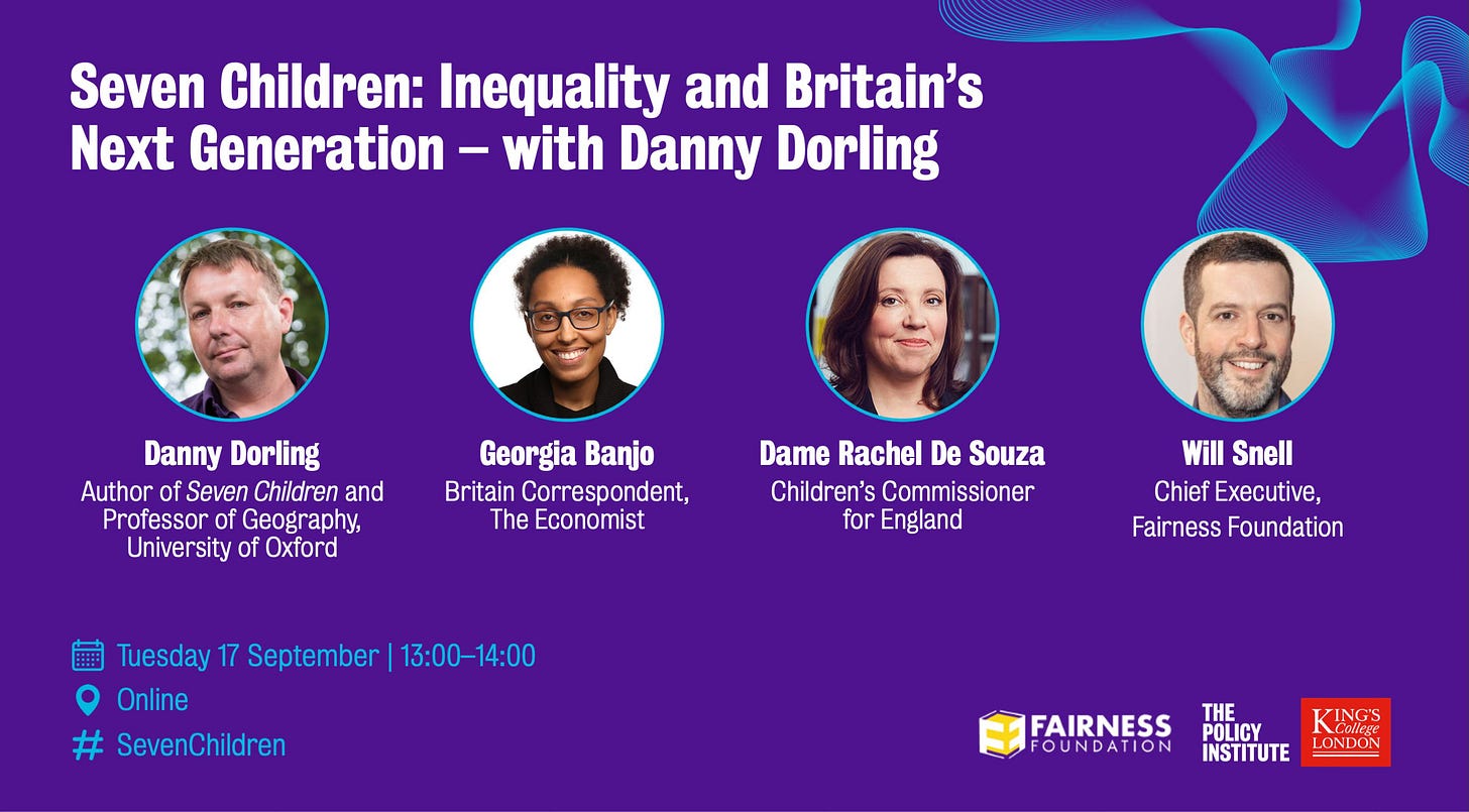 On the subject of inequality, our next event with the Policy Institute at King’s College London is tomorrow (Tuesday 17 September) at 1pm on Zoom, with Danny Dorling discussing his new book, Seven Children, with Dame Rachel De Souza (Children’s Commissioner for England), Georgia Banjo (Britain Correspondent at the Economist), and me. Find out more and sign up here.